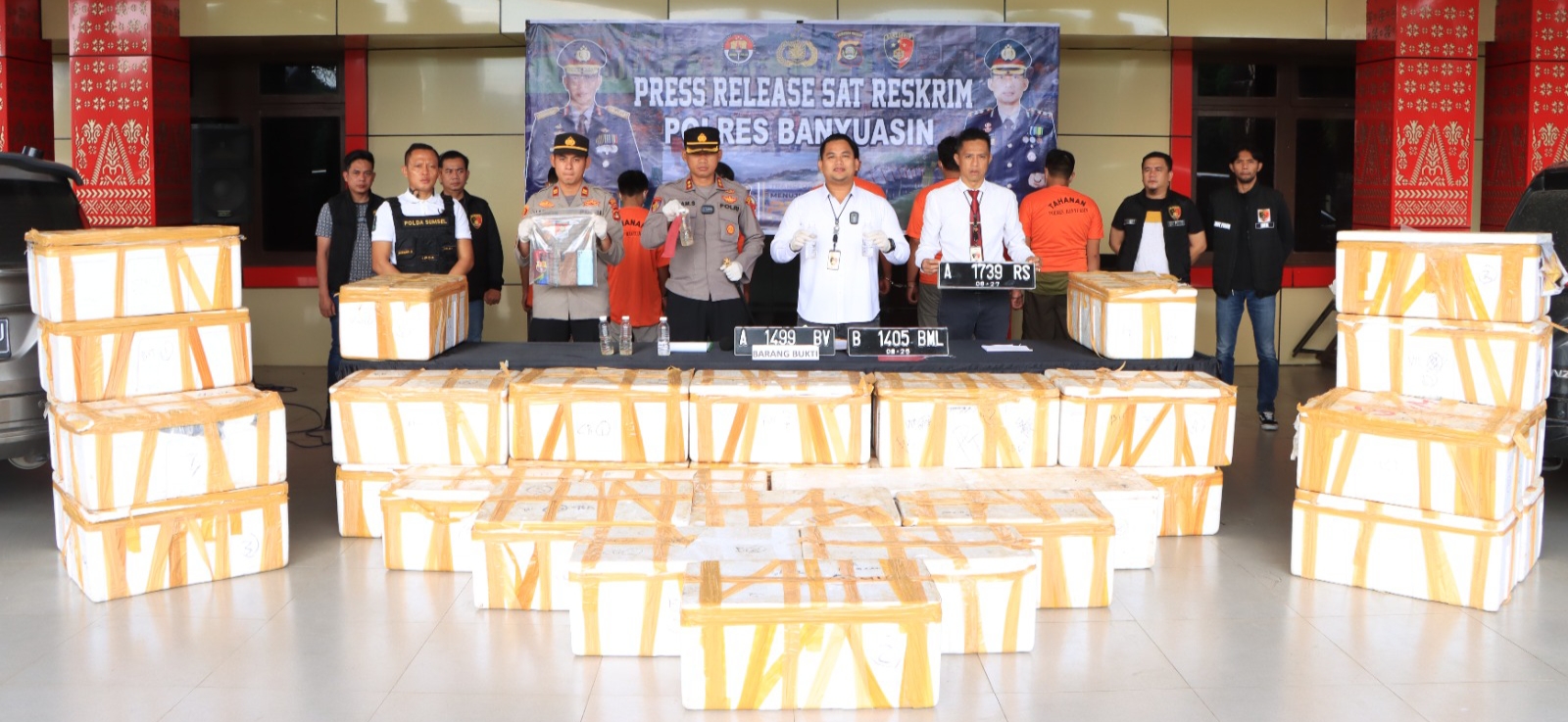 Personel Satreskrim Polres Banyuasin di bantu Sat Polairud Polres Banyuasin dan Satres Polsek Tanjung Lago, berhasil mengamankan 6 orang tersangka beserta barang bukti diantaranya 43 boks styrofoam berwarna putih berisi benih baby lobster, dan 2 unit mobil Ertiga dan 1 unit mobil avanza, dan 6 unit handphone.