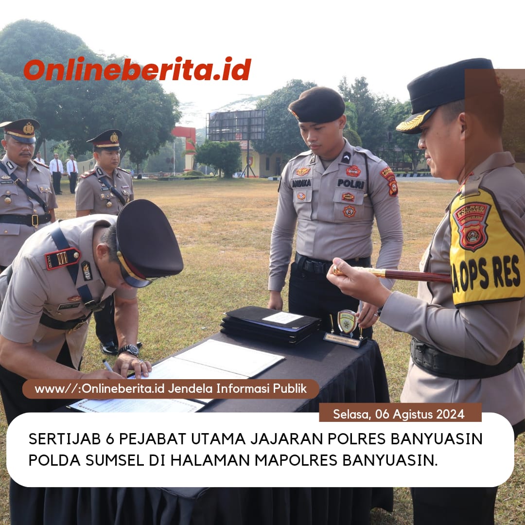 Banyuasin – Sebanyak enam Kapolsek jajaran Polres Banyuasin Polda Sumsel diserahterimakan dalam upacara Serah Terima Jabatan, di lapangan apel Mapolres Banyuasin yang dipimpin oleh Kapolres Banyuasin AKBP Ruri Prastowo, SH, S.IK, M.IK,.