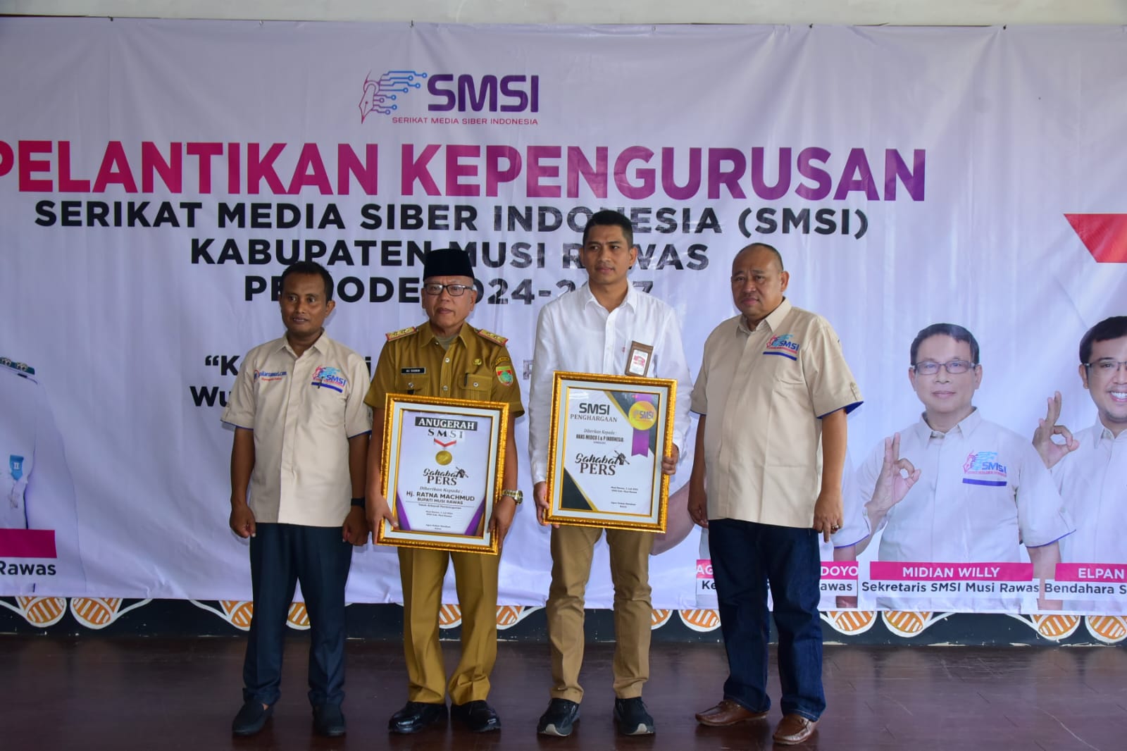 Selain kegiatan pelantikan, SMSI Musi Rawas juga memberikan penghargaan kepada Bupati Hj Ratna Machmud dan mitra swasta Medco E & P.