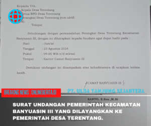 Banyuasin – Camat Banyuasin III Santo, pada Jum’at tanggal 23 Agustus 2023 pukul 09.00 wib, akan memanggil kepala Desa Terentang Herman, anggota BPD dan Perangkat Desa yang diduga di non aktifkan secara sepihak oleh kepala Desa Terentang.