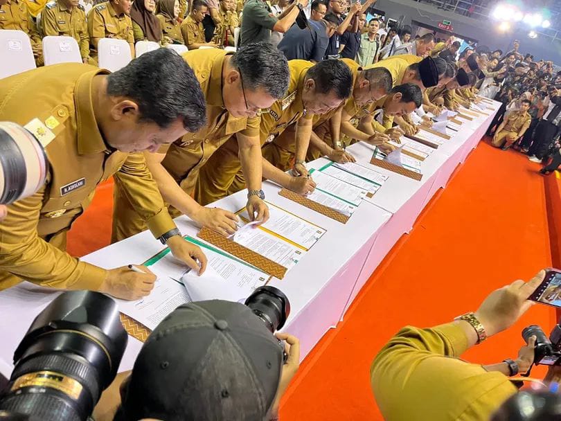 Dalam acara ini juga, Bupati Banyuasin bersama kepala daerah lainnya secara serentak melakukan. (Tim).