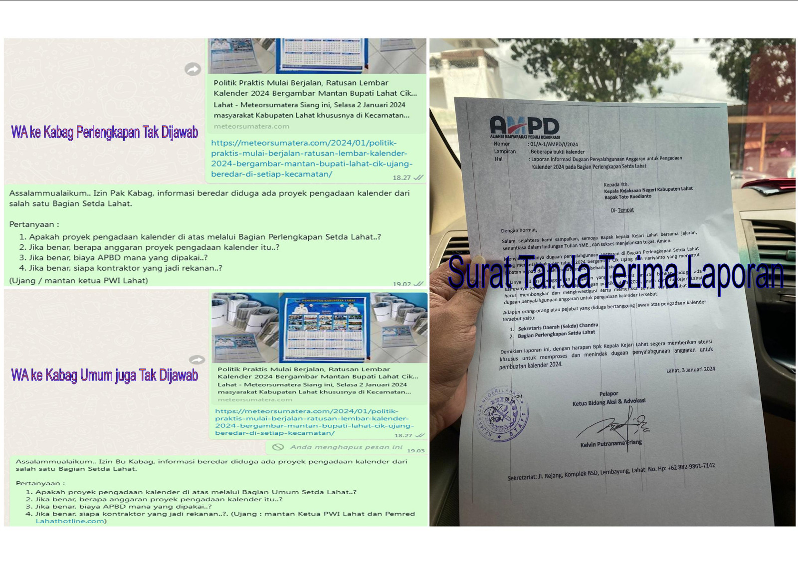 Dalam laporannya, AMPD meminta supaya pihak Kejari Lahat segera memanggil dan memeriksa pihak Bagian Perlengkapan Setda serta Sekda Lahat Chandra, terkait anggaran yang digunakan untuk pengadaan Kalender yang sempat mengguncang Bumi Seganti Setungguan ini pada sore kemarin hingga sekarang.