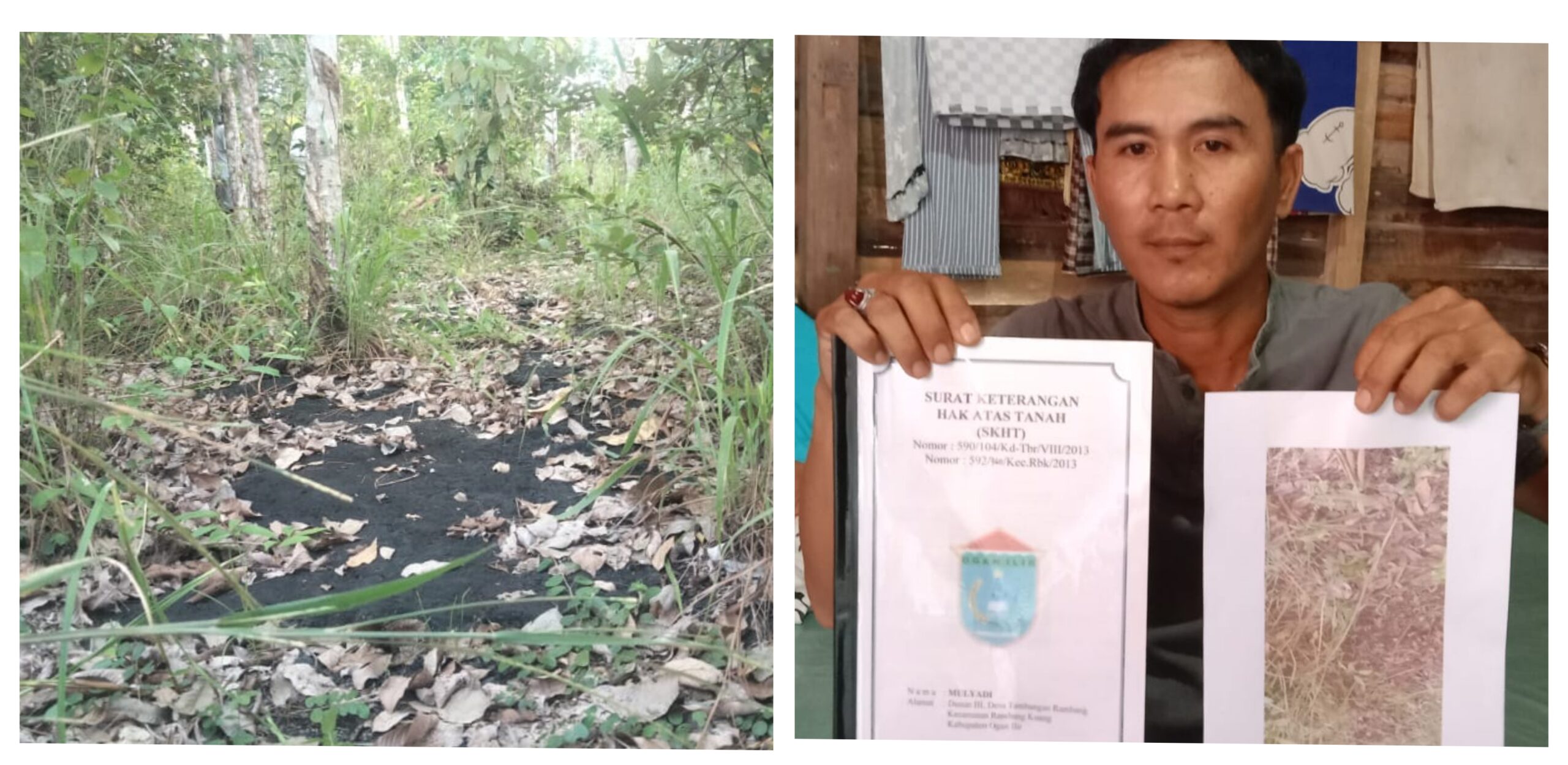 Ogan Ilir – Bustomi (46) perlihatkan surat hak milik atas lahan kebun miliknya yang diduga tercemar limbah minyak padat berlokasi Tanjung Tiga Timur (TTT). Ratusan batang karet milik warga di Desa Tambang Rambang, Kecamatan Rambang Kuang, Kabupaten Ogan Ilir dipastikan tidak produktif lagi.