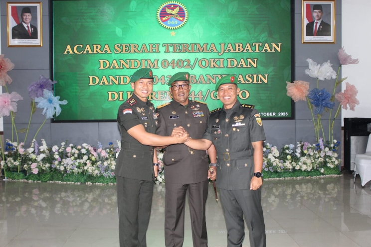 Palembang, Onlineberita.id – Komando Resor Militer (Korem) 044/Garuda Dempo resmi melaksanakan serah terima jabatan dua Komandan Kodim di lingkungan jajarannya, Kamis (9/10/2025). Kegiatan berlangsung di Aula Makorem 044/Gapo, Jalan Jenderal Sudirman Km. 4, Palembang, dan dipimpin langsung oleh Danrem 044/Gapo Brigjen TNI Adri Koesdyanto.