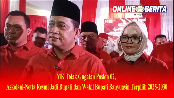 Pelantikan dan Keputusan KPU Meskipun putusan MK telah diumumkan, pelantikan Askolani-Netta sebagai Bupati dan Wakil Bupati Banyuasin masih menunggu penetapan resmi dari Komisi Pemilihan Umum (KPU) Banyuasin. Berdasarkan informasi yang beredar, prosesi pelantikan akan berlangsung pada tanggal 18-20 Februari 2025 di Jakarta.