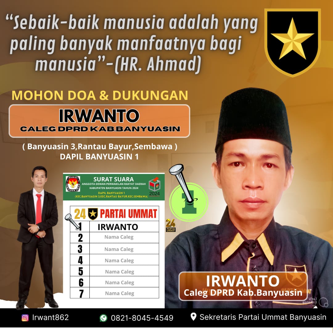 Ia menambahkan, “Selama ini Saya telah berbuat di luar sistem baik secara personal maupun berkelompok, dari organisasi sosial maupun melalui tulisan di media berita online, Namun saya merasa itu belum begitu optimal, karena keterbatasan oleh sebab itu saya mengupayakan untuk masuk sistem Legislatif agar dapat melaksanakan fungsi, tugas dan hak serta kewajiban di jalur legislatif yang dapat membantu masyarakat lebih banyak lagi,” ujar Irwan dari Partai Ummat yang memilih nomor urut 24.