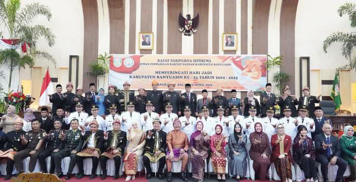 Pangkalan Balai, – Rapat Paripurna Istimewa Dewan Perwakilan Rakyat Daerah (DPRD) Kabupaten Banyuasin dalam memperingati Hari Jadi Kabupaten Banyuasin ke-23 Tahun 2025 dan Ramah Tamah, sekaligus Penandatanganan kerja sama Momerandum of Understanding (MoU) Universitas Sriwijaya Palembang digelar di Gedung Rapat Paripurna DPRD Banyuasin, Kamis (10/4).