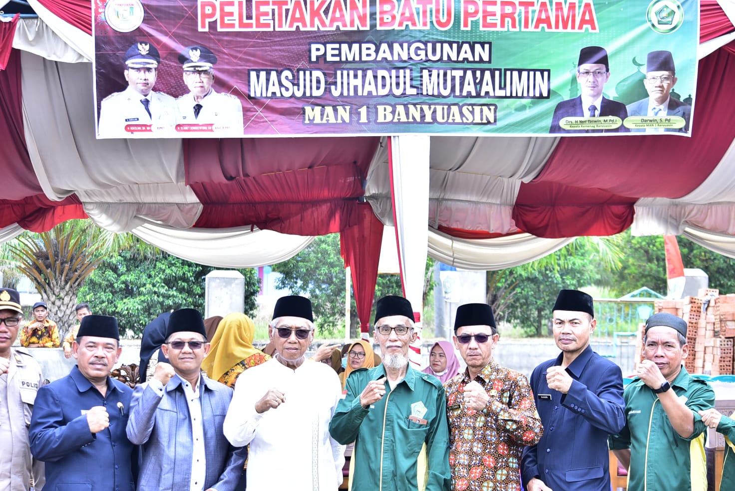 Turut hadir Asisten lll Bahori, AP.,M.SI, Kakan Kemenag Banyuasin Drs. H. Yeri Taswin, M.Pdi, Kabag Kesra H. Sashadiman Ralibi, S.Ag.,M.Pdi, Ketua Dewan Masjid Drs. H. Hamdan, M.Pdi, Dandim 0430 Banyuasin diwakili oleh Kapten Inf Hasidin, Kapolres diwakili Kompol Yuzar Heris, Para Pengurus Madrasah dan Guru MAN 1 Banyuasin, Para Siswa Siswi MAN 1 Banyuasin.