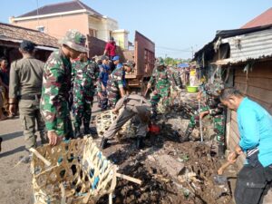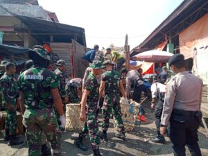 Banyuasin – Satuan Tugas (Satgas) TNI Manunggal Membangun Desa (TMMD) ke 121 Kodim 0430/Banyuasin, hari ini bersama masyarakat sekitar melakukan Bersih-Bersih lingkungan di Area Pasar Rakyat Pangkalan Balai, Kecamatan Banyuasin III Kabupaten Banyuasin.