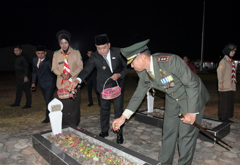 Bertindak sebagai Inspektur Upacara, Bupati Banyuasin Dr. H. Askolani, S.H., M.H., secara langsung memimpin Apel Kehormatan Renungan Suci dan Ziarah secara khidmat pada tengah malam dan diikuti oleh setiap unsur yang mengikuti apel Kehormatan.