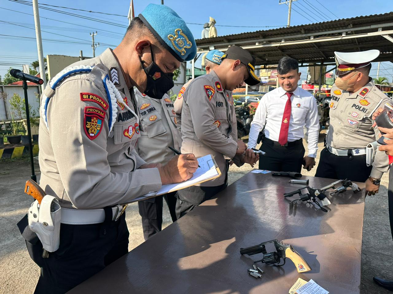 Pemeriksaan senpi seluruh personil dilakukan pagi hari di halaman mapolsek setempat, berjalan lancar dan kondusif.