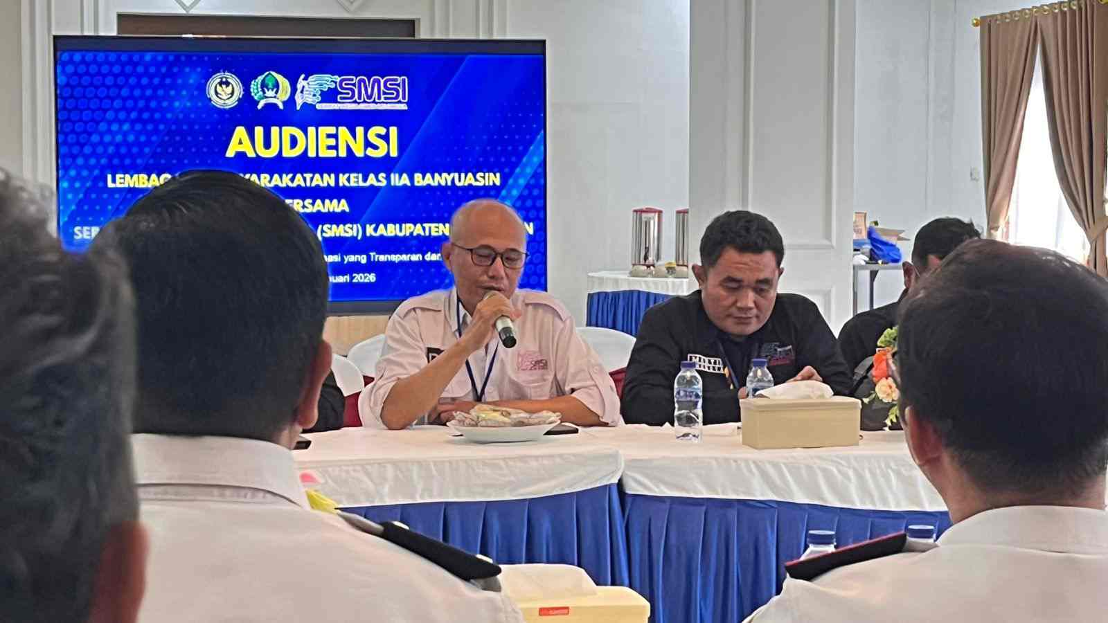 Audiensi tersebut dipimpin langsung Ketua SMSI Banyuasin, Sumantri Adie, SE, dan diterima Kepala Lapas Kelas IIA Banyuasin, Dr. Tetra Destorie Imantoro, A.Md.IP., S.Sos., M.H., bersama jajaran pejabat struktural, di Aula Lapas Kelas IIA Banyuasin, awal tahun 2026.