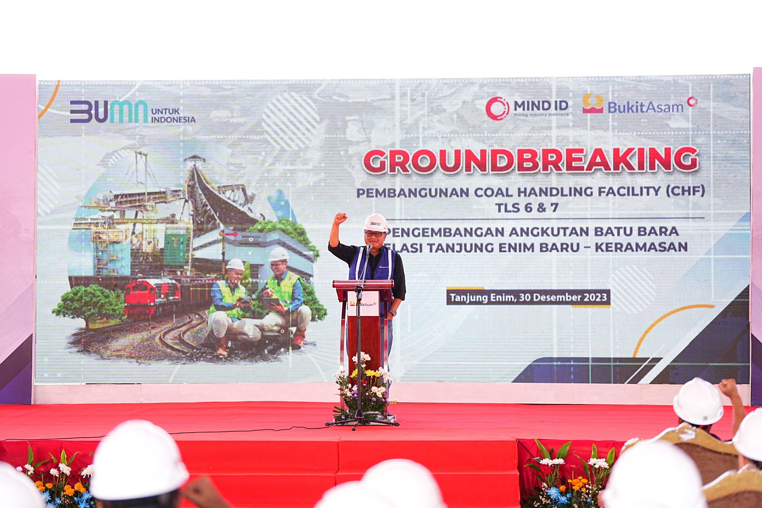 Muara Enim, Onlineberita.id – PT Bukit Asam Tbk (PTBA), anggota Grup MIND ID, memulai pembangunan fasilitas penanganan batu bara (coal handling facility) baru, untuk meningkatkan kapasitas angkutan batu bara melalui jalur kereta api relasi Tanjung Enim – Keramasan. Hal ini ditandai dengan prosesi peletakan batu pertama (groundbreaking) yang dilakukan di Tanjung Enim pada Sabtu (30/12/2023).