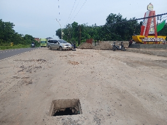 Tiga buah lubang besar di sisi trotoar, tepat di area tugu batas kota, dinilai membahayakan pengguna jalan dan bahkan telah menimbulkan banyak kecelakaan.